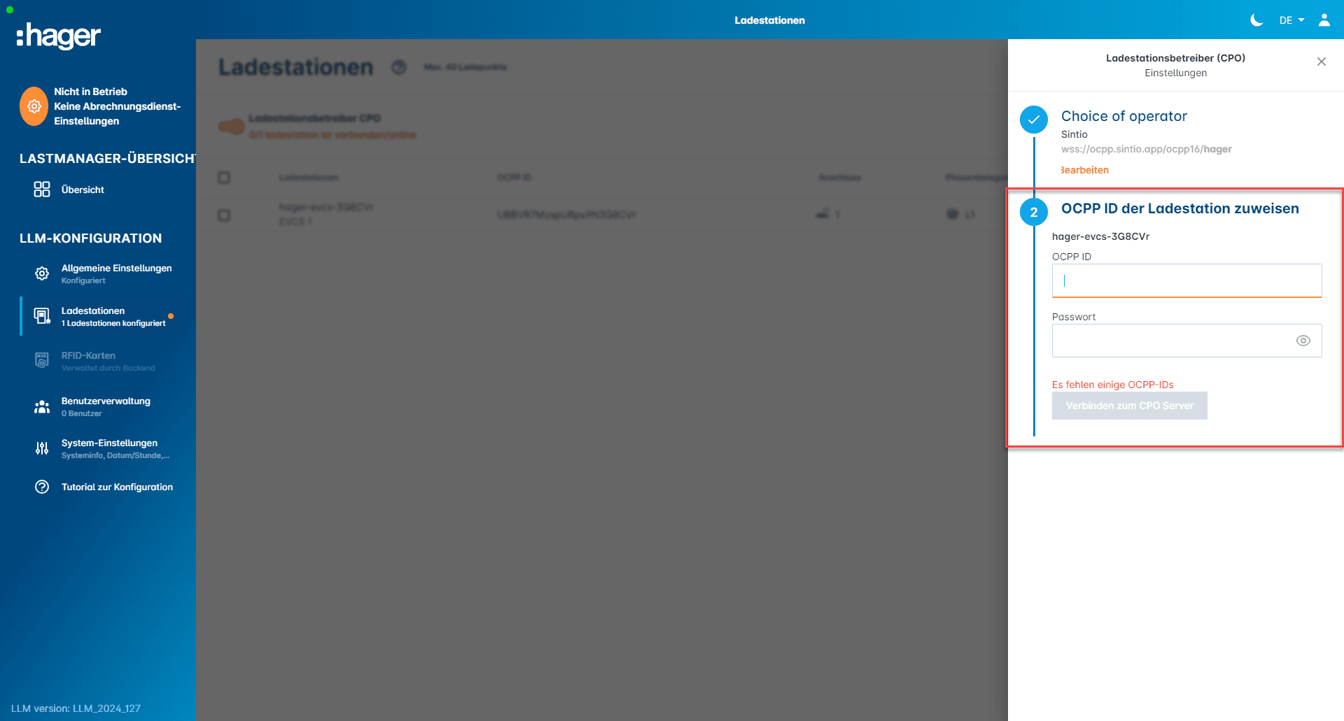 Select Sintio as the billing provider under Settings. Define the name of your organization similar to the Sintio portal. You can find the OCPP-ID in the general settings, which is specified for the Hager charging station. How to find the password is described here.