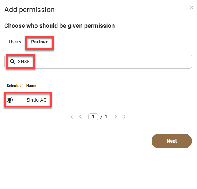 - Under Partner you can enter the Lookup key XN3E, select Sintio and confirm with Next.